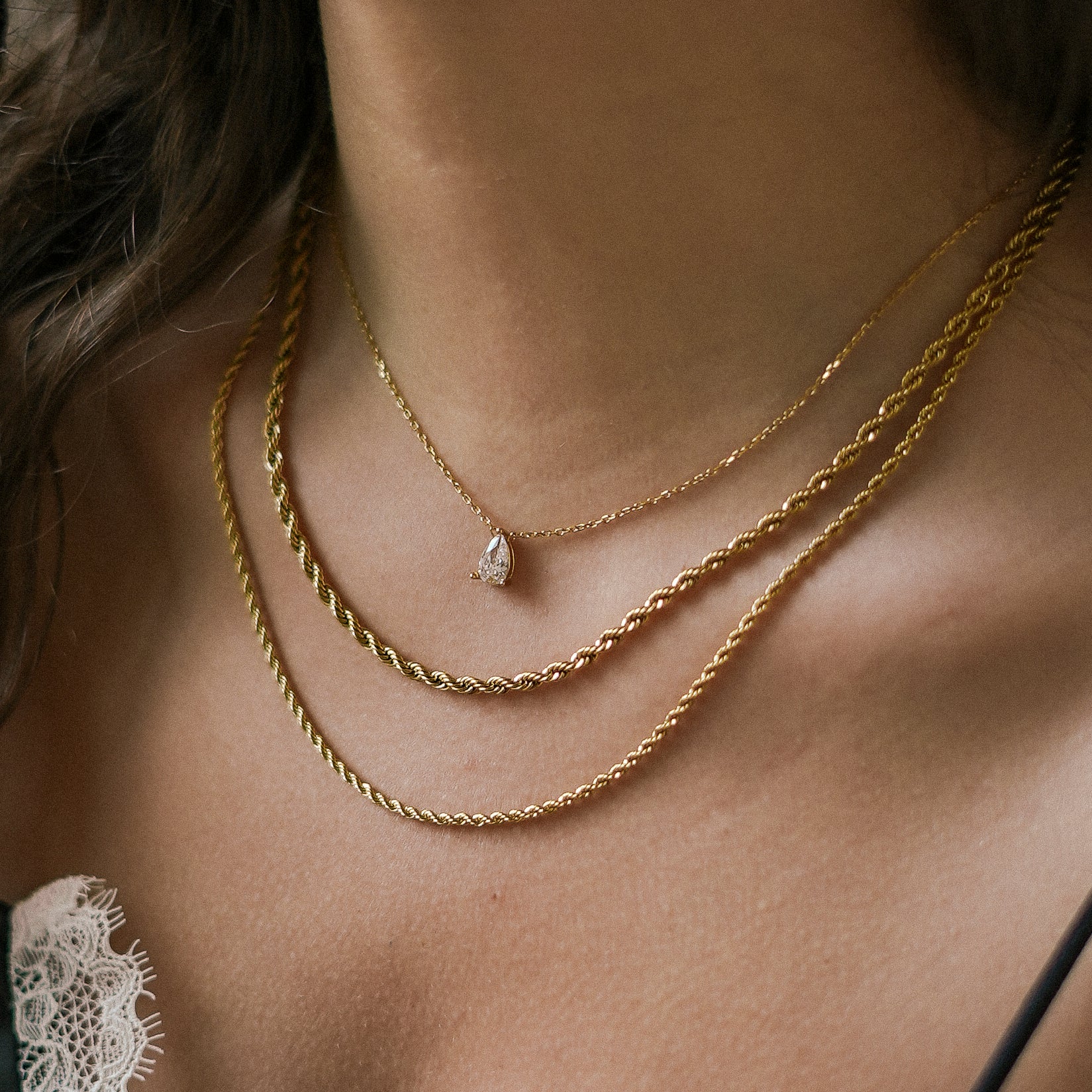 This stainless steel 18k gold plated necklace features a unique twisted chain design, perfect for layering. Choose from multiple length options for a personalized look. Elevate any outfit with this versatile and durable accessory.